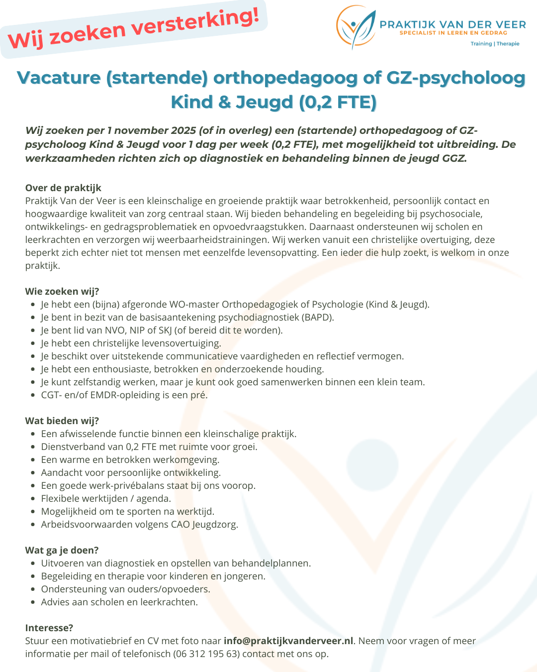 Wij vinden het belangrijk dat je meteen aan de slag kunt. Daarom streven we ernaar géén wachtlijst te hebben.